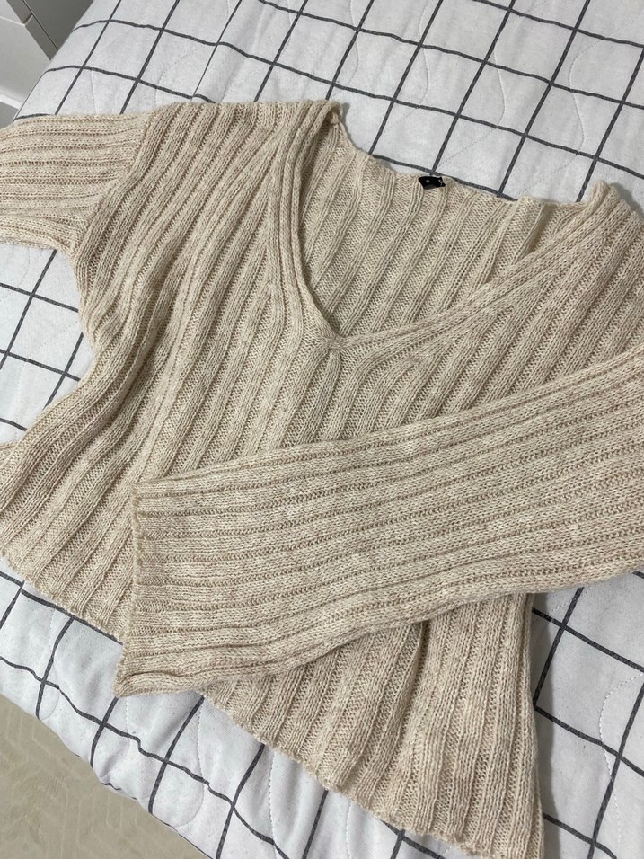 Bej renkli, V yaka ve uzun kollu örgü kadın kazak. Rahat ve bol kesimiyle günlük kullanıma uygundur.