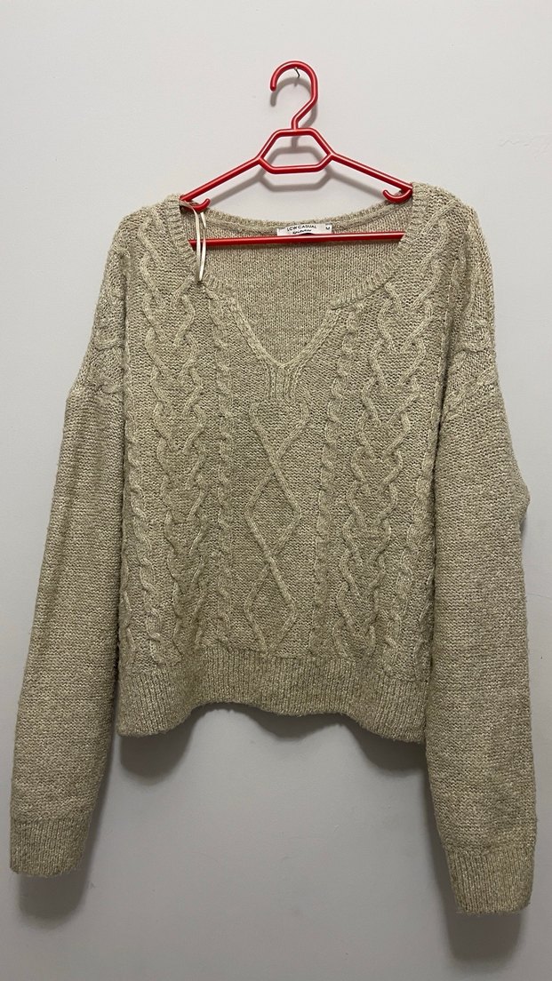 Bej renkli, V yakalı ve uzun kollu örgü kadın kazak. Rahat kesimi ve normal boyuyla günlük kullanıma uygundur. Lcw markadır az kullanıldı M beden salaştır