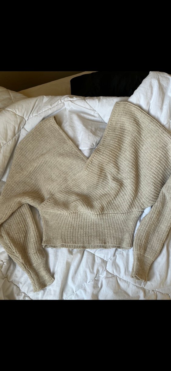 Bej renkte, V yaka ve uzun kollu, rahat kesim örgü kadın kazak, günlük rahat stil için uygundur. her bedene olur