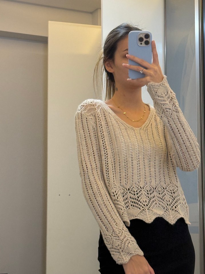 Bej renkli, V yaka ve uzun kollu kadın kazak. Yumuşak örgü kumaştan, bol kesim ve bohem tarzda, günlük kullanıma uygun. S beden