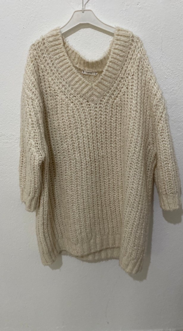 Fora knıt marka Bej renkli, V yaka ve uzun kollu örgü kadın kazak, bol kesimiyle rahat ve bohem bir tarz sunar.