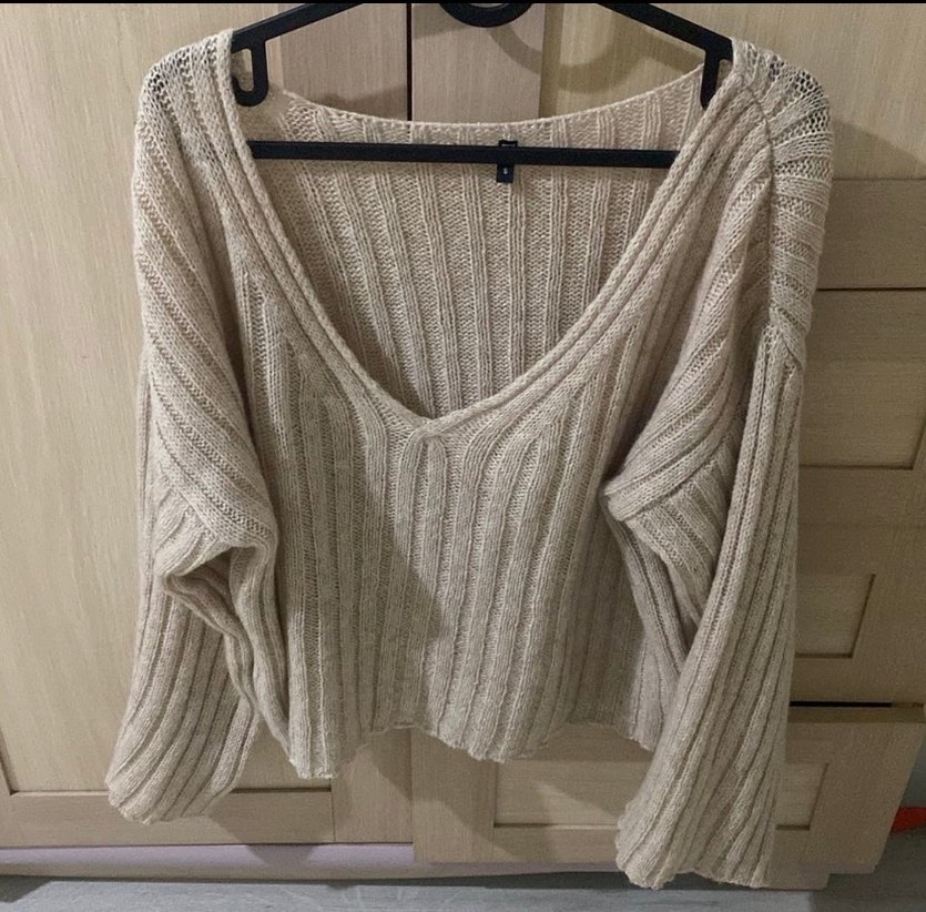 Bej renkli, V yakalı ve uzun kollu kadın kazak, bol ve rahat kesime sahiptir. Yumuşak örgü kumaştan yapılmış, bohem tarzda günlük kullanıma uygundur. S beden olmasına rağmen fazlasıyla boldur