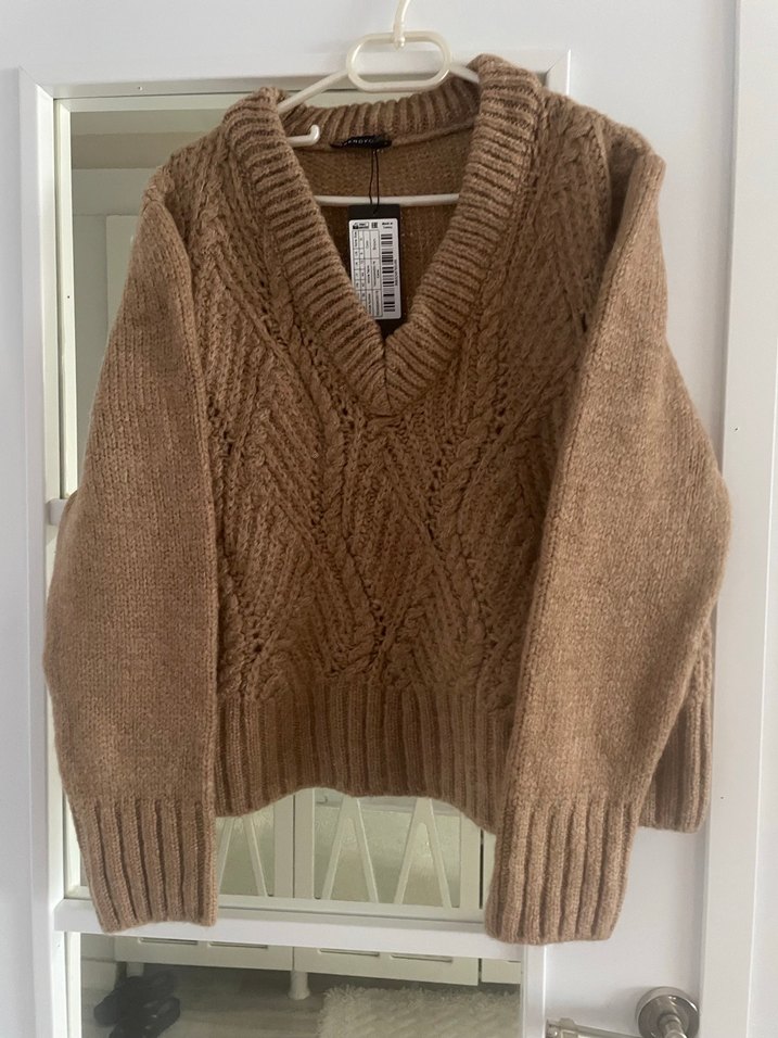 Bej renkli, V yakalı ve uzun kollu örgü kadın kazak, rahat kesimiyle günlük kullanıma uygundur.