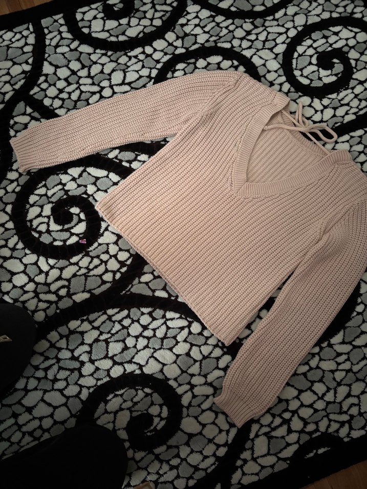 Bej renkli, V yaka ve uzun kollu örgü kadın kazak. Rahat kesimi ve normal boyu ile günlük sokak stili için uygundur.