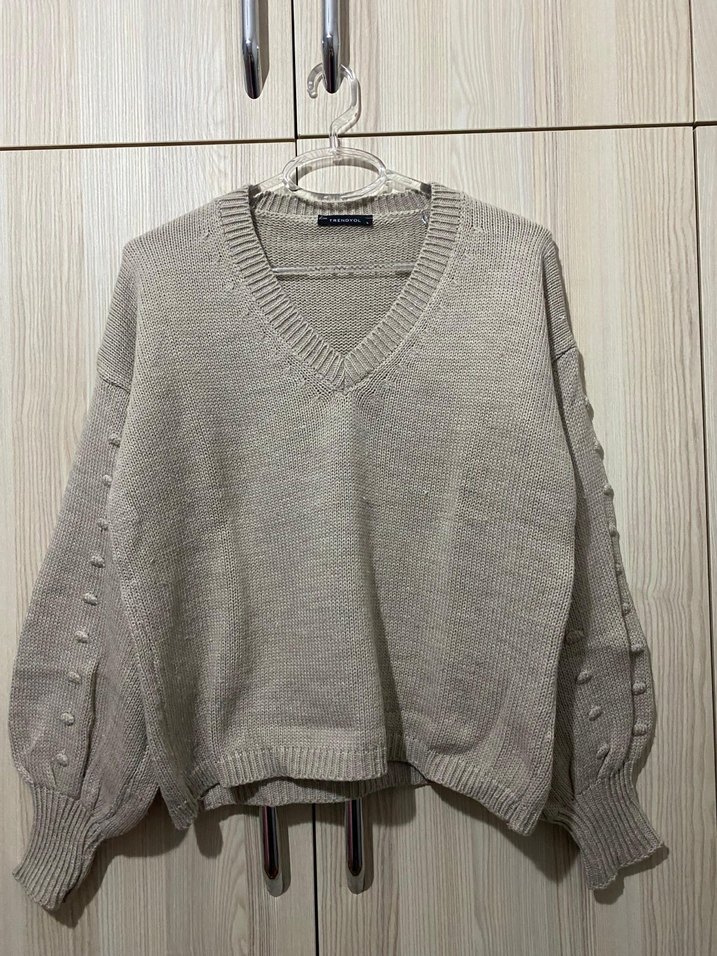 Bej renkli, V yaka, uzun kollu ve düğme detaylı örgü kadın kazak. Rahat kesimi ve yumuşak dokusuyla gündelik kullanıma uygundur.