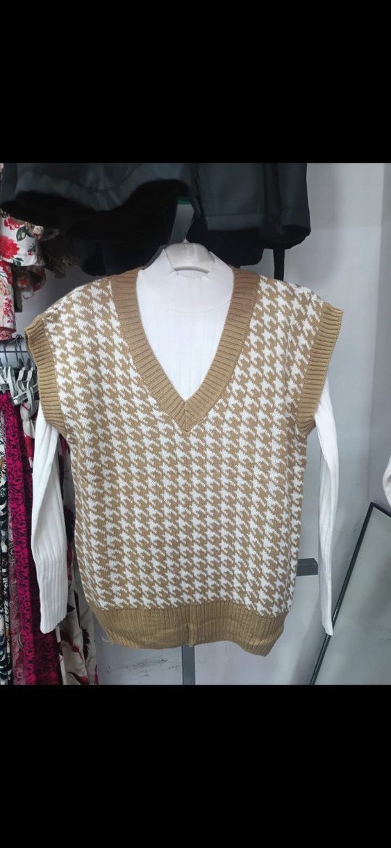Bej renkli, V yaka ve bol kesim kadın örgü süveter. Kolsuz, rahat ve günlük kullanım için uygundur.