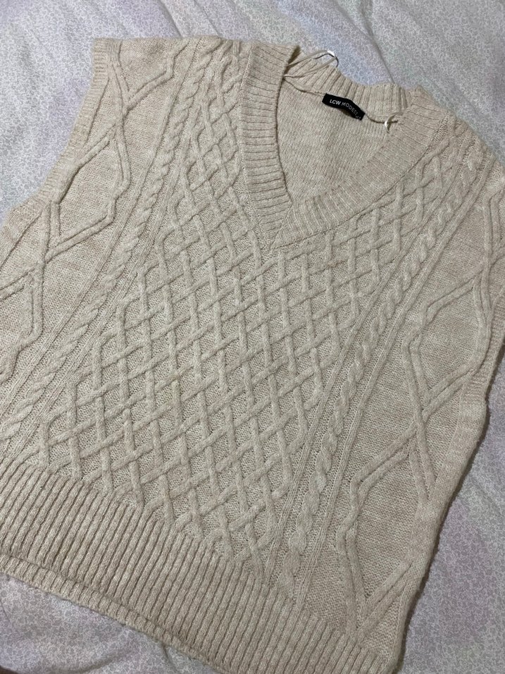 Bej renginde, V yaka ve salaş kesime sahip örgü kadın süveter. Dokulu deseniyle rahat ve şık bir sokak stili sunar.