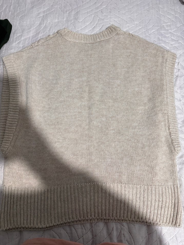Bej renkli, V yakalı, örgü kumaştan yapılmış, salaş kesim süveter