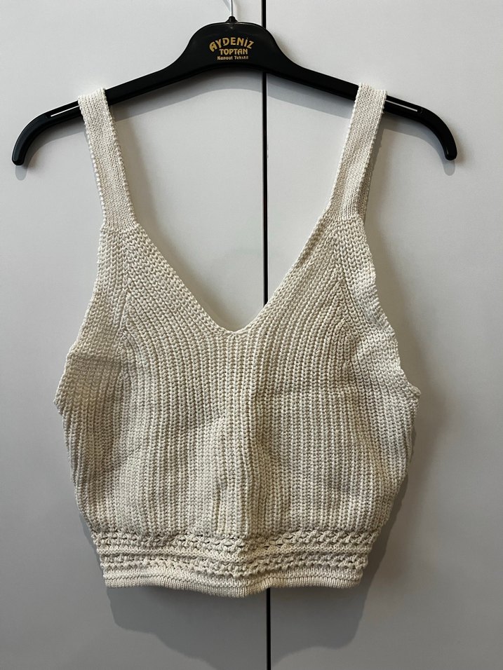 Bej renkli, V yaka, kolsuz, kısa ve fitted kesim örgü büstiyerdir. Yumuşak örgü kumaşıyla rahat ve bohem tarzda, retro hissi verir.