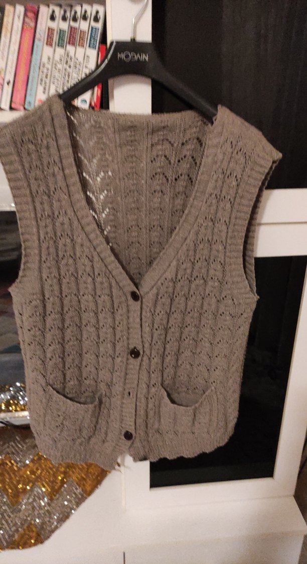 Bej renkli, V yaka, düğmeli, cepli, örme ve kolsuz kadın yeleği. Rahat ve bol kesim, günlük kullanıma uygun. omuz kisminda hafif söküğü var resimde görüldüğü gibidir digmelerind gevşeme vardır ve bir düğmesi eksiktir fiyatı uygun dur l.xl uyumludur göğüs bölgesi 43.uzunlugu 67