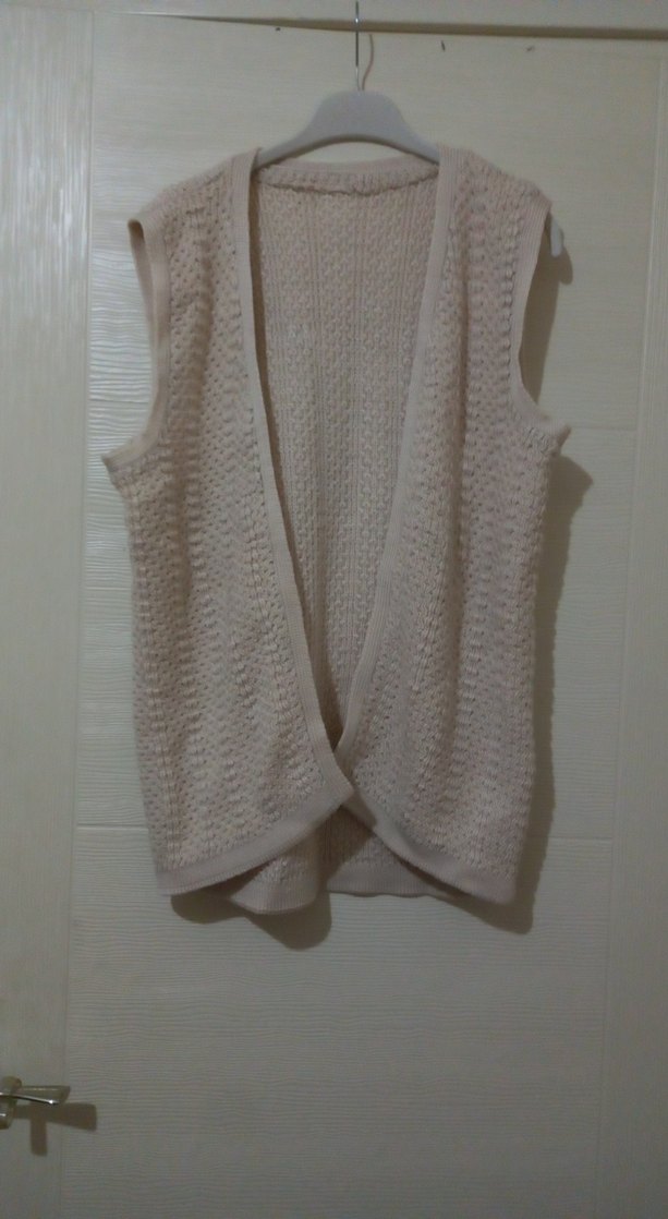 Bej renk, V yaka, örme dokulu, kolsuz, normal midi boy, bol kesim kadın yelek. Rahat ve sade tasarıma sahip.