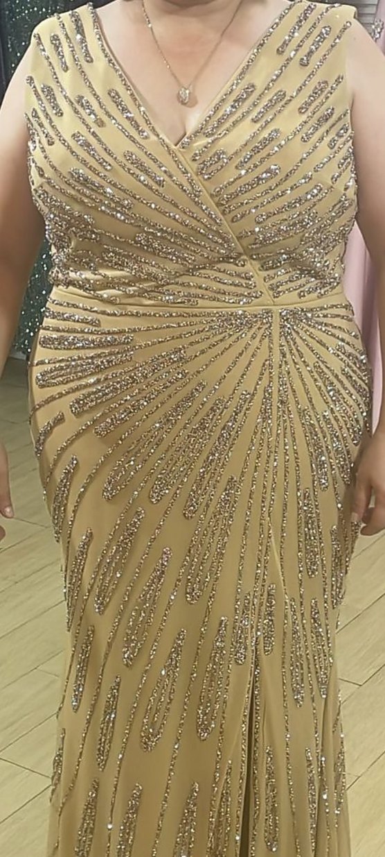 V yaka ve ince askılı, bej renkli uzun ve vücuda oturan elbise. Parlak payet işlemeleri ve nakış deseniyle süslenmiş, düğünler için uygun. ✨