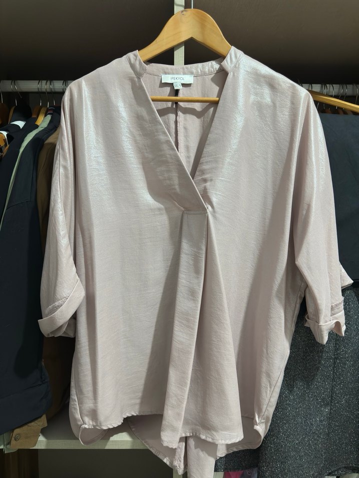 Bej renkte, V yaka ve kısa kollu, salaş kesim kadın gömleği. İpeksi kumaştan, drapeli tasarıma sahip, günlük kullanıma uygun.