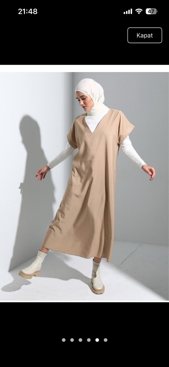 Bej renkli, V yakalı ve kolsuz uzun elbise. Salaş kesimi ve sentetik kumaşıyla rahat ve sade, günlük kullanıma uygun minimal bir parça.