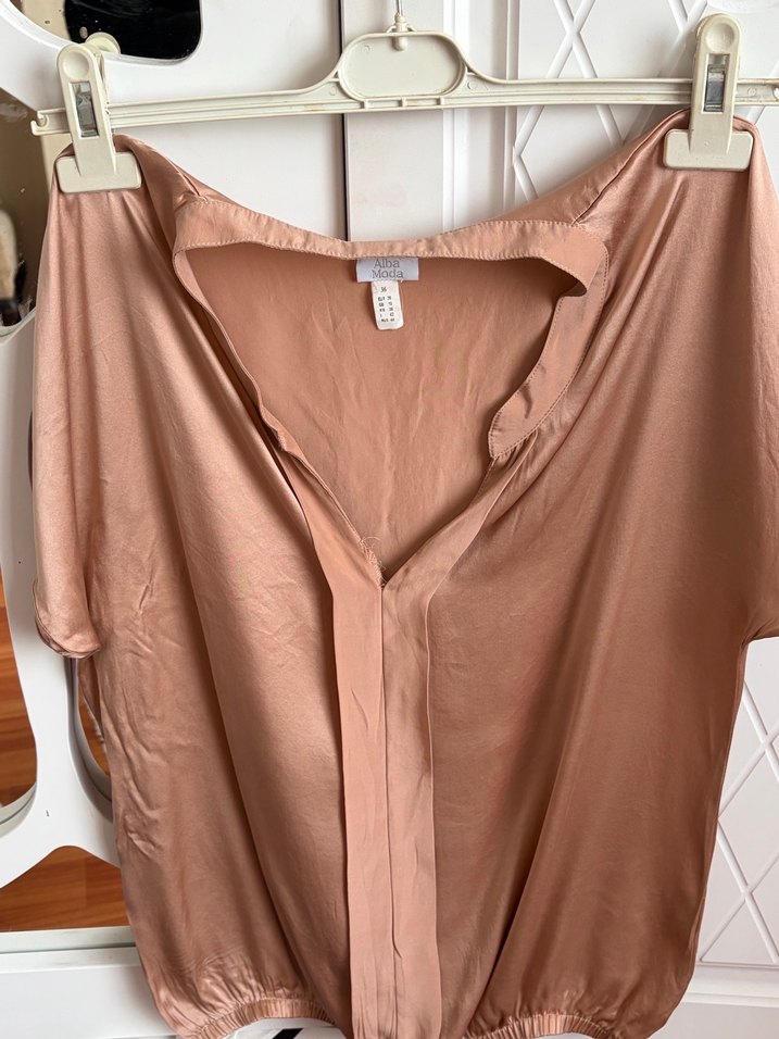 Bej renkli, V yaka ve kısa kollu, saten görünümlü, bol kesim ve drapeli detaylı bluz. Parlak ve minimal tasarımıyla günlük kullanıma uygundur. ✨