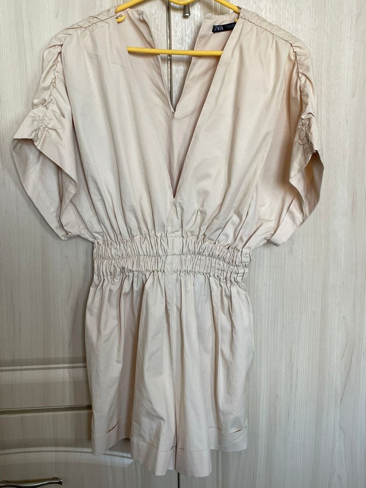 Bej renkli, V yakalı, kısa kollu tulum. Bel kısmı lastikli. Sırt kısmı da V şeklinde. Omuz üstleri büzgülü. Zara marka. XS beden.