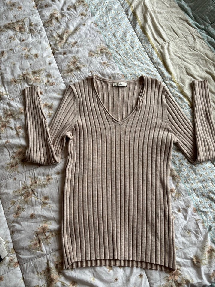 Bej renkte, V yaka ve uzun kollu, fit kesim triko kazak. Fitilli dokusu ve normal boyu günlük kullanıma uygundur. Boyu uzun gibi gözükmüş ama tam bel boyunda , likralı inanılmaz rahat bir kazak