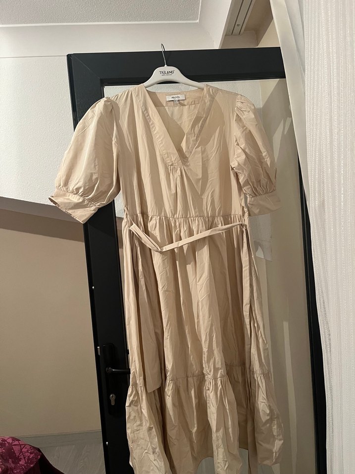 Bej renginde, V yakalı, bol kesim, drapeli uzun elbise. Yumuşak keten kumaştan, bohem tarzda günlük kullanım için uygundur.