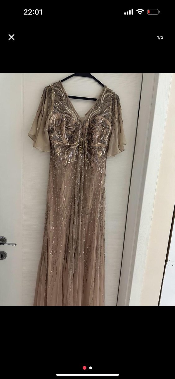 Bej renkli, V yaka ve drapeli detaylara sahip uzun abiye elbise. Kolsuz ve bol kesim, düğün ve özel davetler için uygundur. ✨