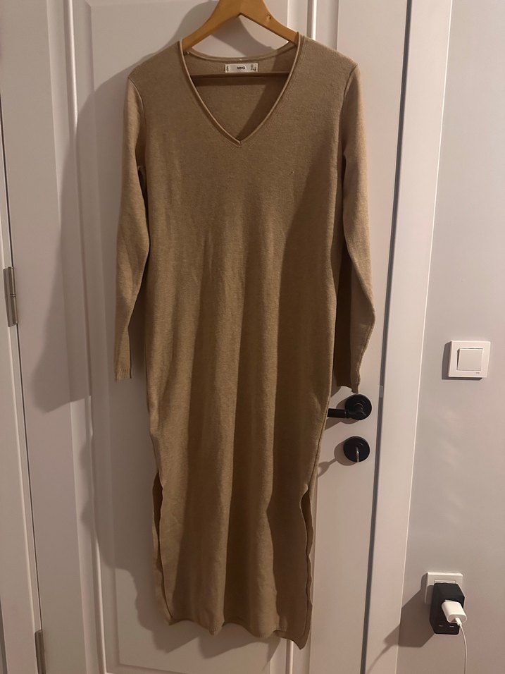 Bej renkli, V yakalı ve uzun kollu, bol kesim uzun elbise. Desensiz sade tasarımıyla rahat ve şık bir görünüm sunar. İki yanda hafif yırtmacı var
