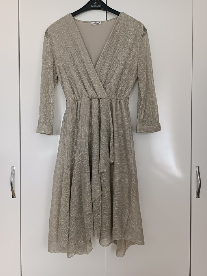 1 kez giyildi marka temsili✨ Bej renkli, keten kumaştan uzun elbise. V yaka, pileli ve bol kesim tasarımıyla modern klasik ve Paris tarzını yansıtır. Ofis için uygundur.