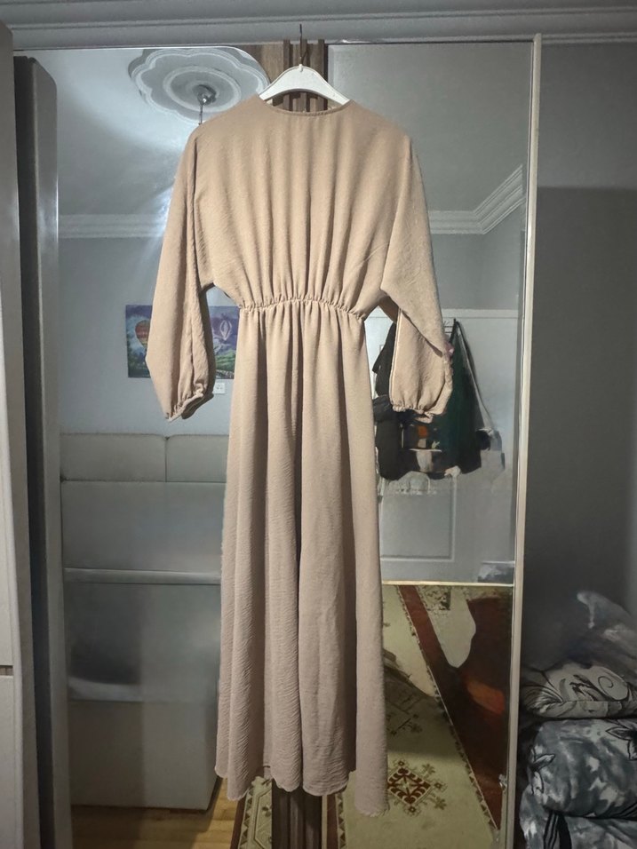 Bej renkte, keten kumaştan yapılmış, V yakalı ve uzun kollu, bol kesim, drapeli uzun elbise. Rahat ve mütevazı bohem tarzda, günlük kullanıma uygun.