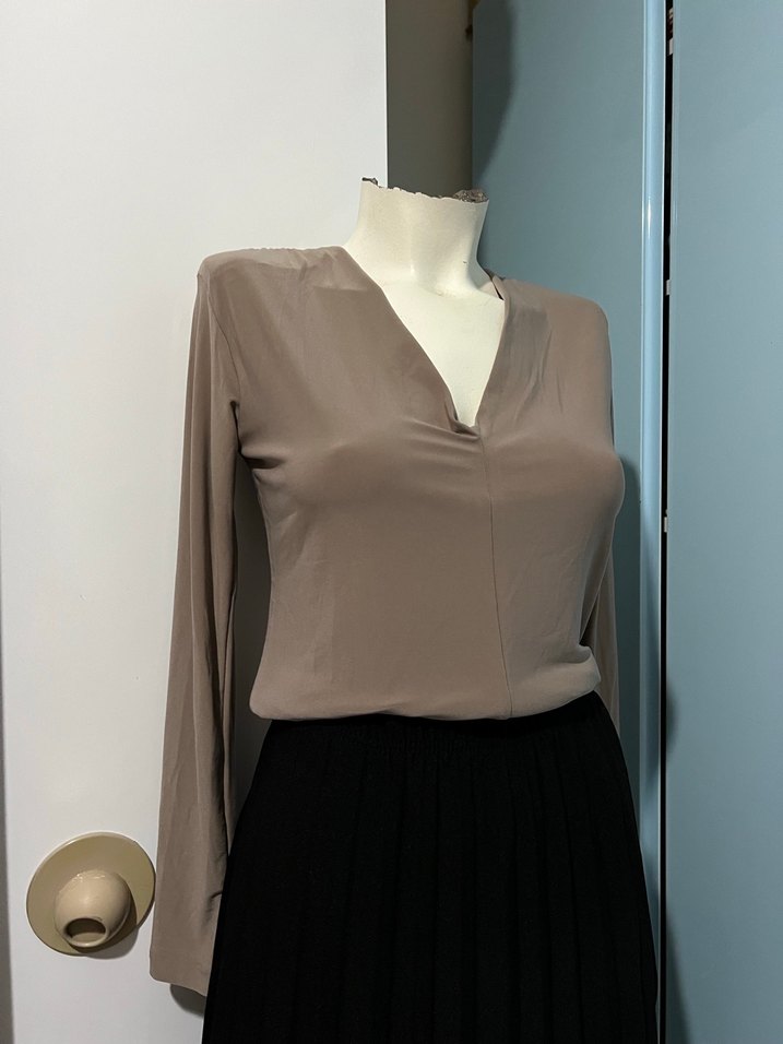 Bej renkli, V yaka ve uzun kollu kadın bluz, satenimsi yumuşak kumaştan üretilmiştir. Salaş ve uzun kesimiyle ofis için şık ve çağdaş bir görünüm sunar. ✨