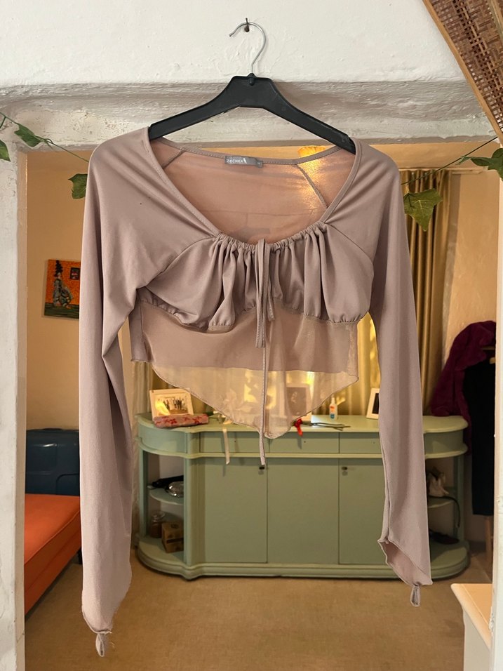 Bej renkli, V yakalı, uzun kollu ve dökümlü tasarımlı kadın bluz. Rahat kesimi ve midi boyu ile yumuşak keten kumaştan üretilmiştir.