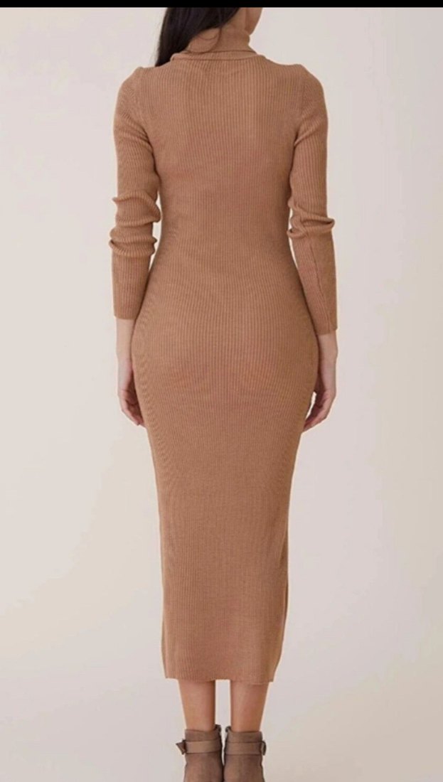 V yaka ve uzun kollu, bej renkte, vücuda oturan uzun elbisedir. Yumuşak sentetik kumaştan yapılmış, minimalist ve çağdaş tarz sunar. 36-38 uyumludur