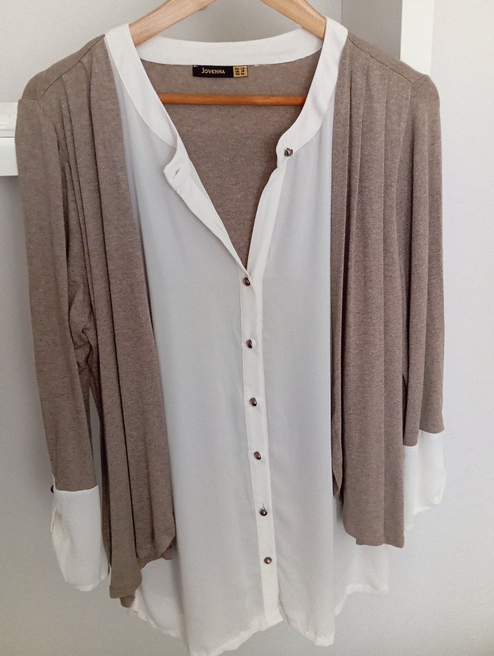 Bej renkli, V yaka ve düğmeli uzun kollu kadın hırkası. Yumuşak keten kumaştan, bol kesim ve midi boyda, günlük kullanım için uygundur.