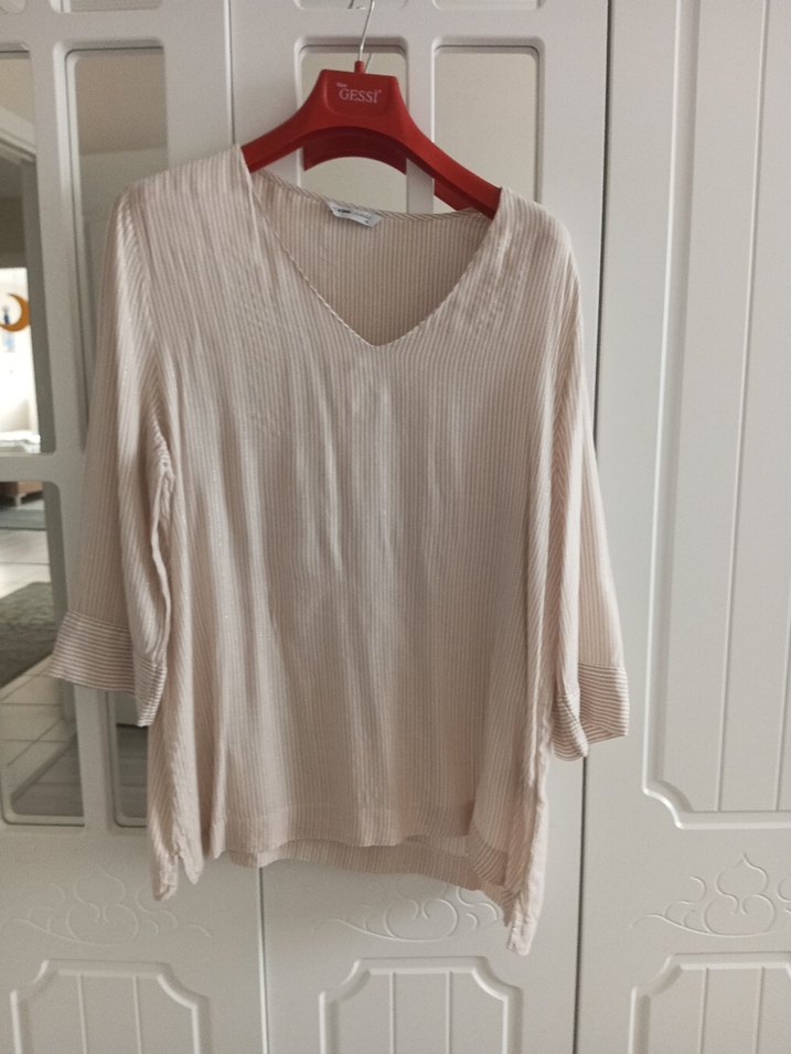 Bej renkli keten kumaştan yapılmış, uzun kollu ve V yakalı kadın gömleği. Salaş kesimi ile gündelik kullanıma uygundur,