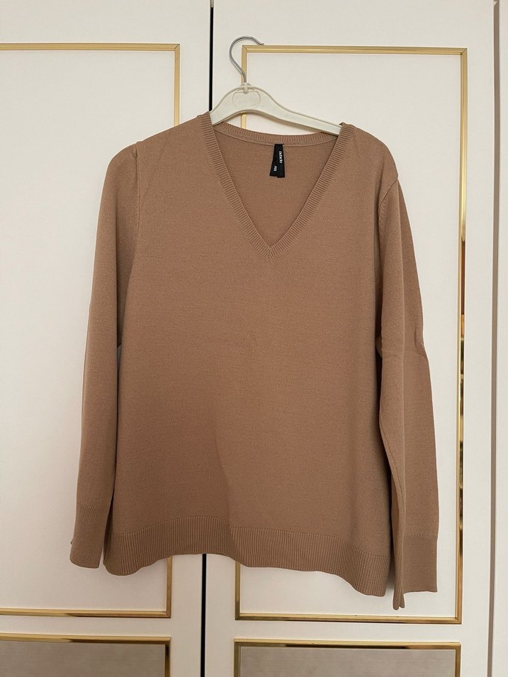 Bej renkte, V yakalı ve uzun kollu kazak. Rahat, normal boyda ve , gündelik kullanıma uygundur.