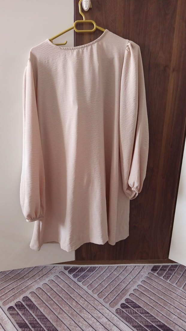 Bej renkte, uzun kollu, bol kesim ve drapeli midi tunik. Yumuşak keten kumaştan, minimal V yakalı, desensiz sade tasarım. Günlük kullanım için uygundur.