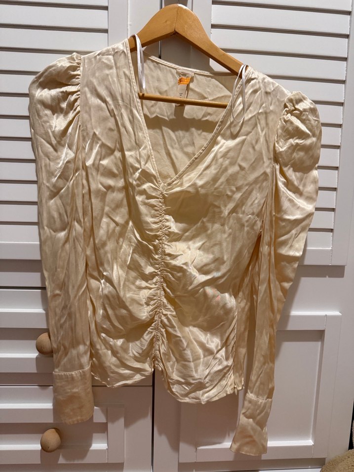 Bej renkli saten bluz, drapeli V-yaka ve uzun kolludur. Salaş kesimi ve midi boyuyla vintage esintili bohem tarz sunar. Ütüleme fırsatım olmadı boy 55 cm en 40 cm