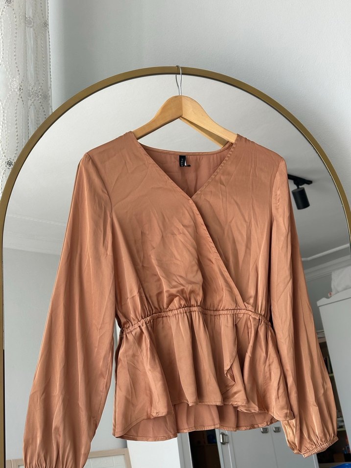 Bej renkli, satenimsi parlak kumaştan, dökümlü ve bol kesimli kadın bluz. V yaka ve uzun kollu, midi boyda, gündelik kullanıma uygun.