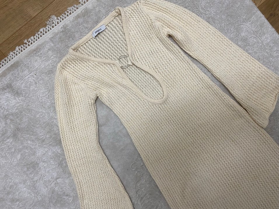 Bej renkte, uzun kollu ve V yaka, triko kumaştan yapılmış, rahat ve bohem tarzda uzun kesim fitted kazak.