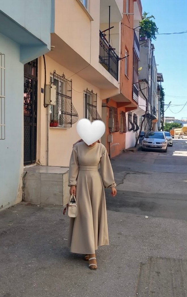 Bej renkli, V yakalı ve uzun kollu bu uzun elbise, ince sentetik kumaştan üretilmiştir. Düzenli kesimi ve desensiz yapısıyla günlük kullanım için şık ve sade bir tercihtir.
