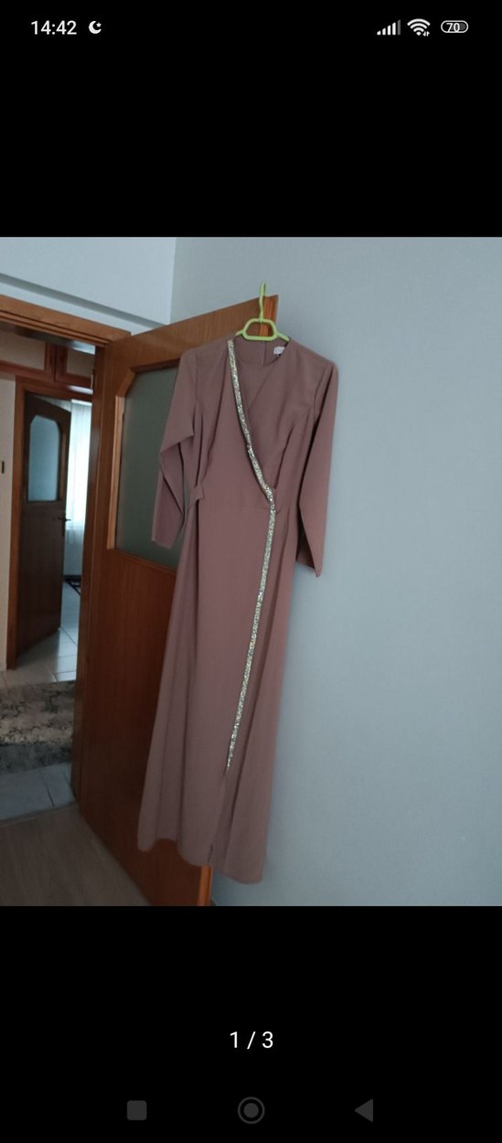 Bej renkli, V yakalı ve uzun kollu bu uzun elbise, drapeli tasarımıyla sade ve rahat bir görünüm sunar. Günlük kullanım için uygundur.