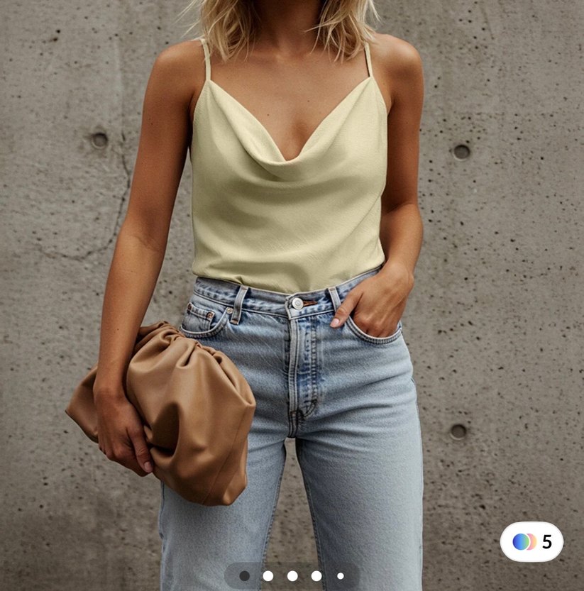 Bej renkte, V yakalı ve ince askılı kadın üstü. Denim kumaştan, bol kesim ve midi boyda. Desensiz tasarımı günlük sokak stiline şıklık katıyor.