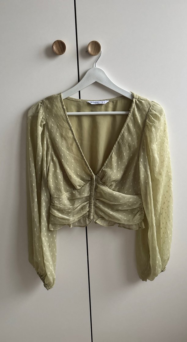 Bej renkli, V yakalı, drapeli ve uzun kollu kadın bluz. Hafif keten kumaştan, bol kesim ve kısa boyda, bohem tarzda.