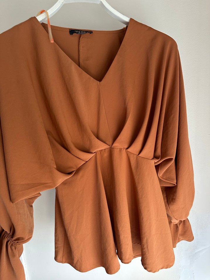 Bej renkli, V yakalı, bol kesim ve drapeli kadın bluz. Uzun kollu, normal midi boyunda, parlak keten kumaştan üretilmiştir. Minimalist ve bohem tarzda, ofis için uygundur. ✨