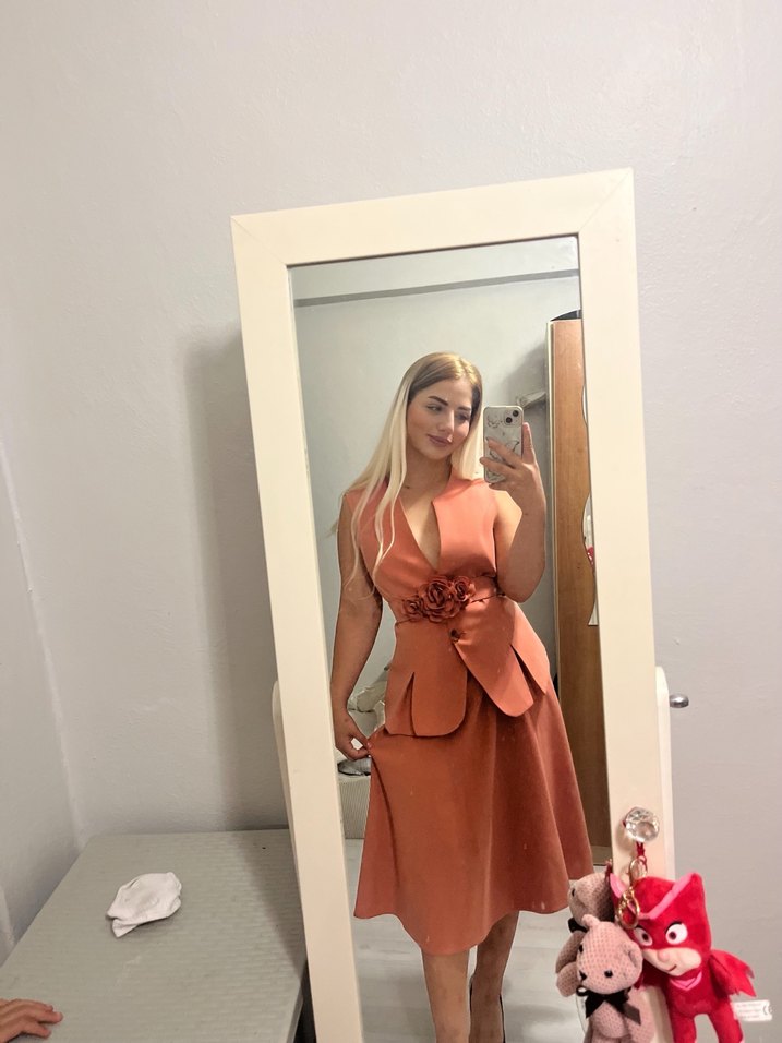 Bej renk, kolsuz, V yaka ve drapeli tasarıma sahip mini elbise. Belde çiçek detayı bulunur. Ofis kullanımı için uygun, rahat kesim ve açık ton.