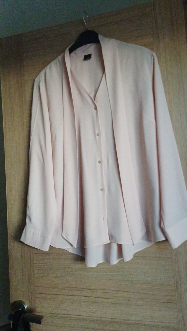 toz pembe renkte, uzun kollu, V yakalı ve düğmeli kadın gömleği. Rahat kesimli ve ipeksi dokulu, ofis kullanımı için uygun. Kendinden flarlı