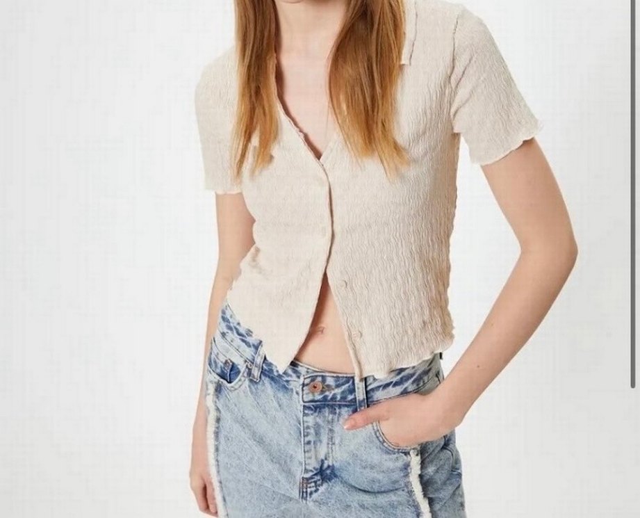 Bej V Yakalı Düğmeli Kısa Kollu Gömlek Yaka Bluz Bürümcük