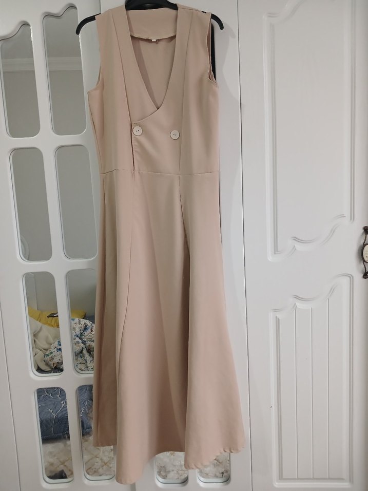 Düğmeli, V yakalı, bej uzun elbise. Kolsuz, düz kesim ve sentetik yumuşak kumaştan.