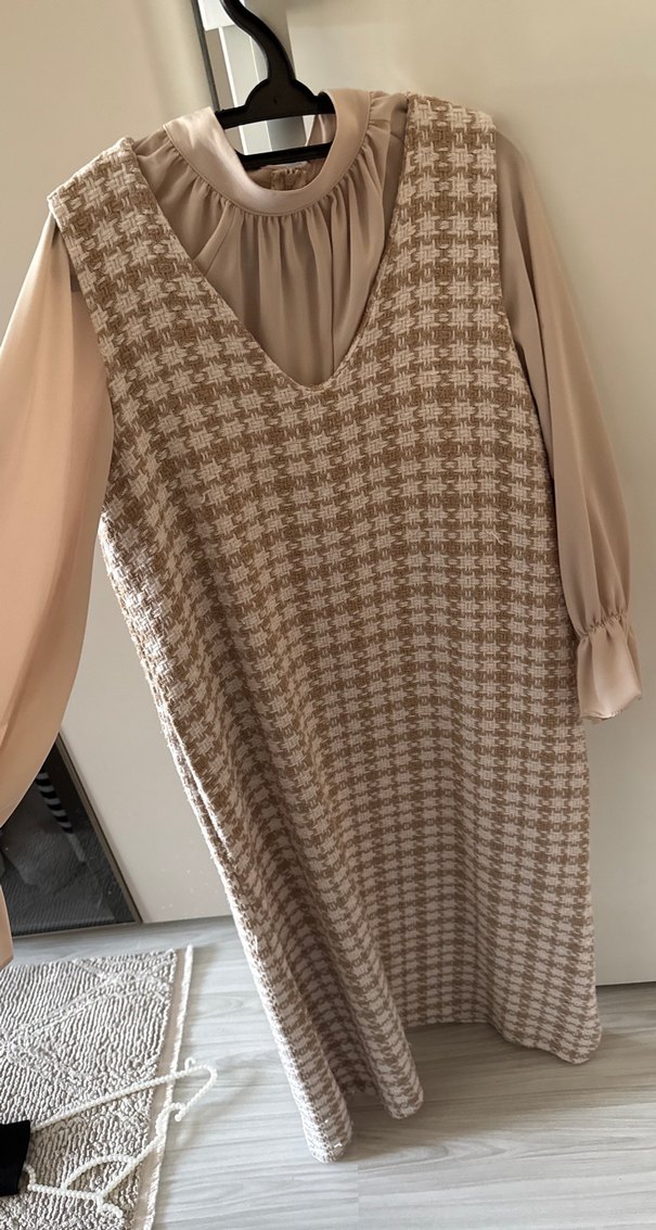 Bej V Yakalı Ekose Desenli Uzun Elbise