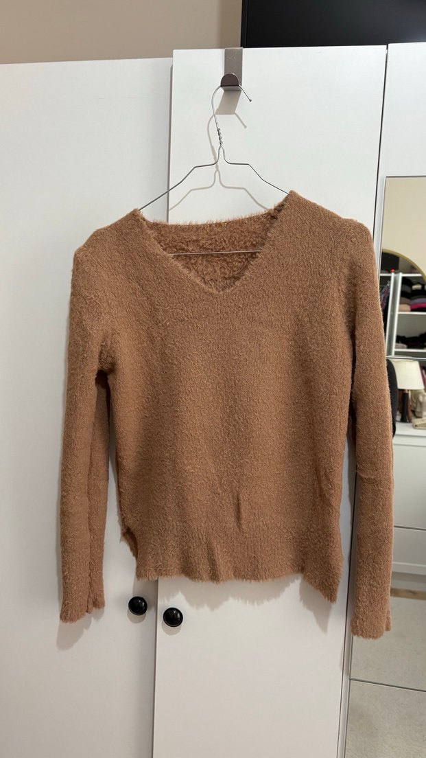 Bej renkli, V yakalı ve uzun kollu bu ince örgü kazak, günlük kullanıma uygun, vücuda oturan rahat bir yapıya sahiptir. Yumuşak örgü kumaşı konfor sağlar.