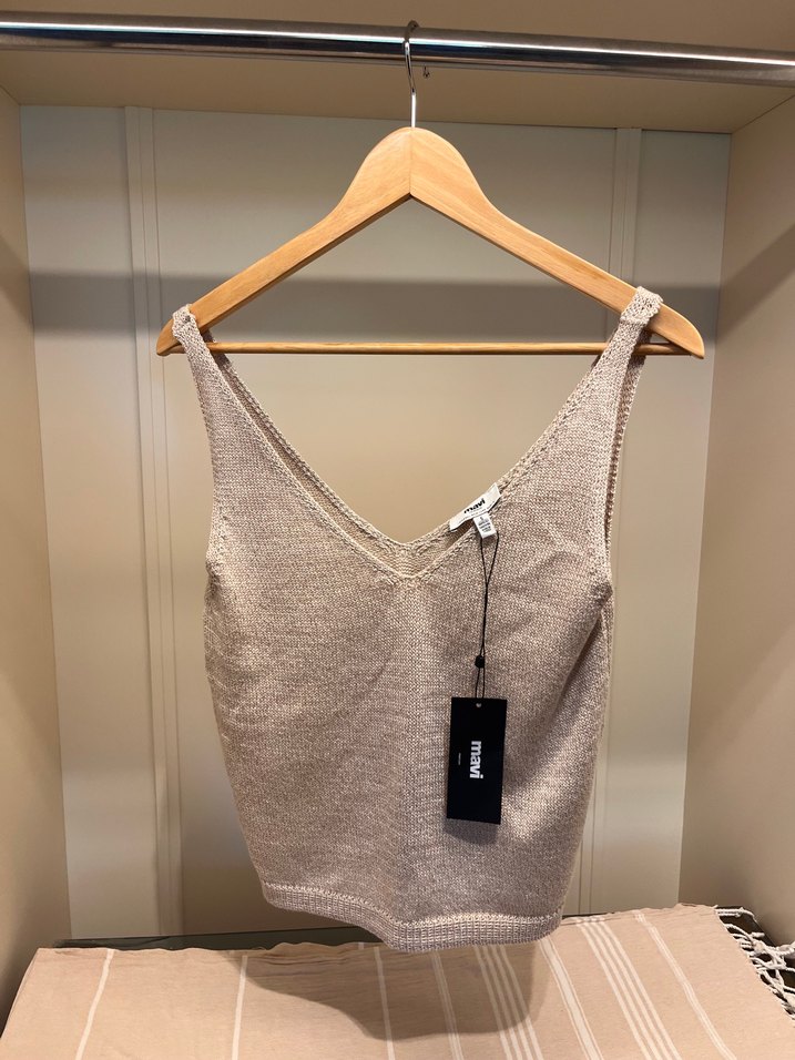 Yumuşak viskon kumaştan, V yakalı, askılı bej renkli bol kesim kadın atlet.