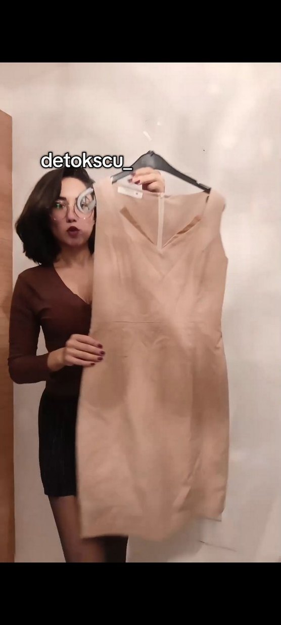 Bej, v yakalı, kolsuz, dar kesim kadın elbise. Minimalist ve normcore tarzda, hafif ve desensiz kumaş ile rahat şıklık sunar.