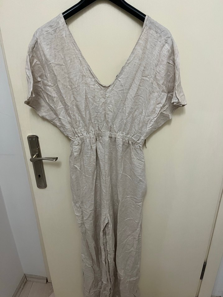 Yumuşak keten kumaştan, bol kesimli, V yakalı ve kısa kollu uzun bej tulum. Dökümlü tasarımıyla minimal ve bohem tarz sunar.